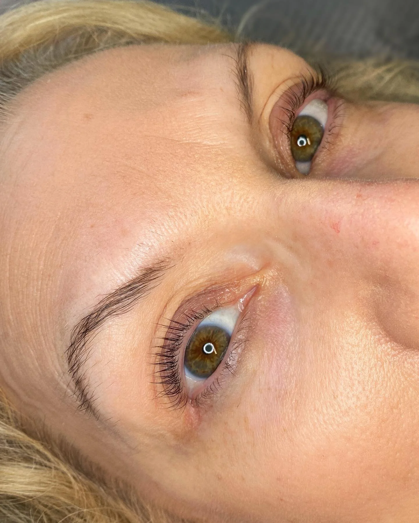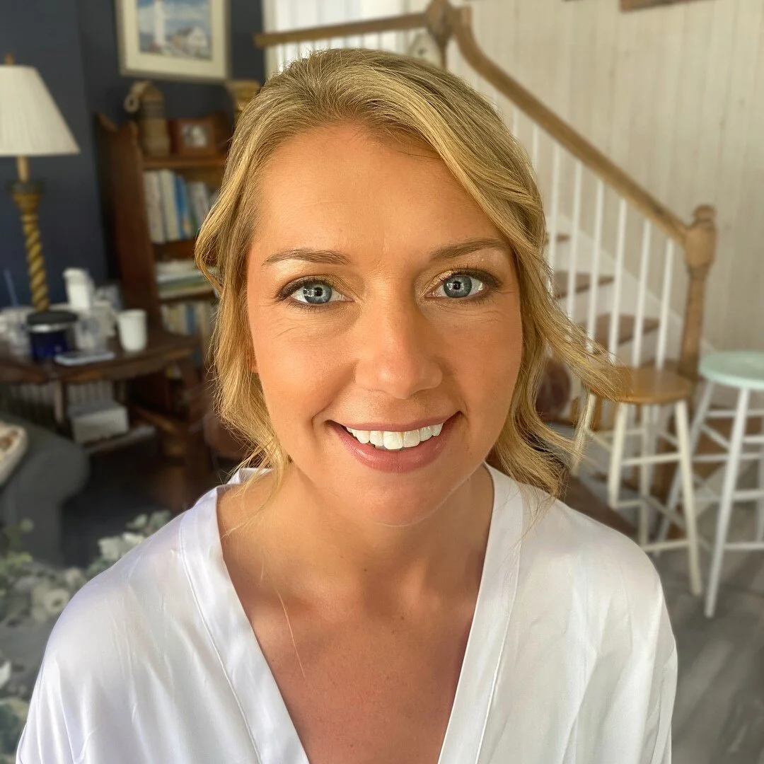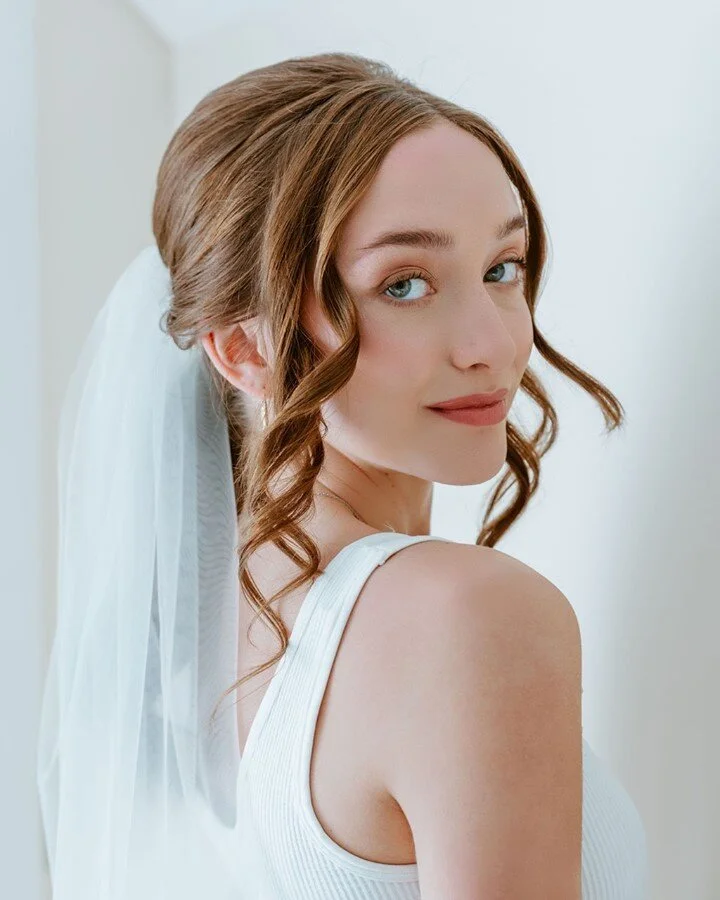 Traditional makeup with false eyelashes and hair curled or lightly styled